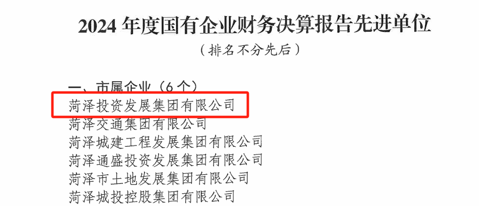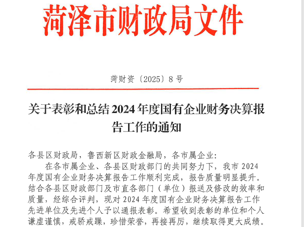 菏澤投資集團(tuán)榮獲2024年度國有企業(yè)財(cái)務(wù)決算報(bào)告工作“先進(jìn)單位”稱號