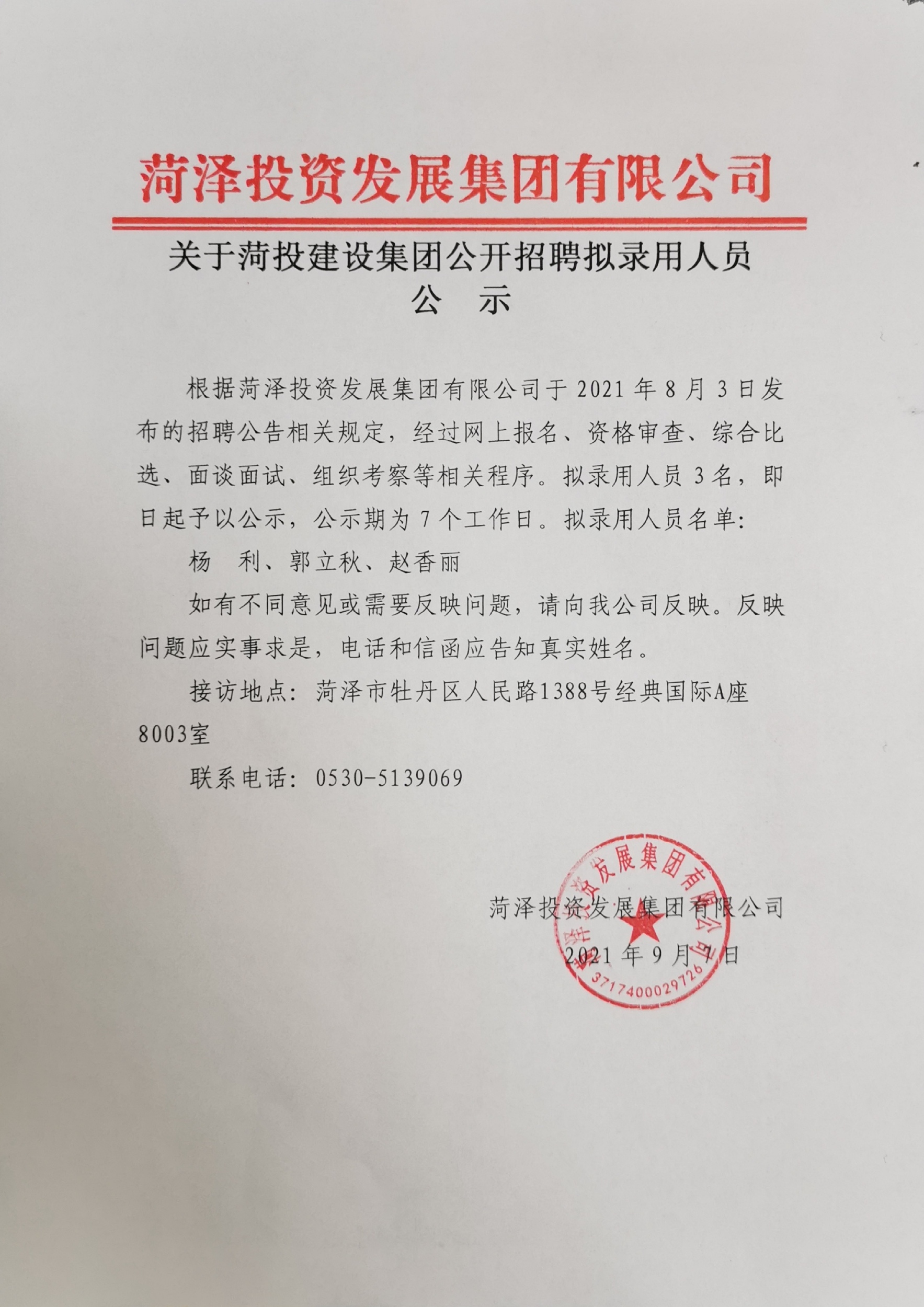 關(guān)于菏投建設(shè)集團(tuán)公開招聘擬錄用人員公示