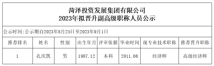 菏澤投資發(fā)展集團(tuán)有限公司2023年擬晉升副高級(jí)職稱人員公示