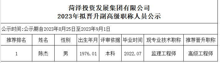 菏澤投資發(fā)展集團(tuán)有限公司2023年擬晉升副高級職稱人員公示