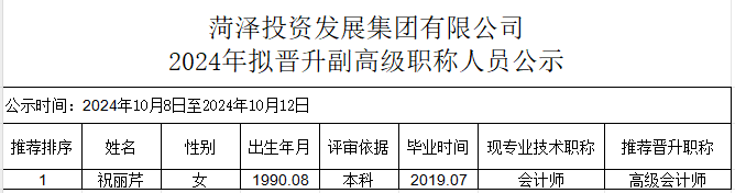菏澤投資發(fā)展集團(tuán)有限公司2024年擬晉升副高級(jí)職稱人員公示