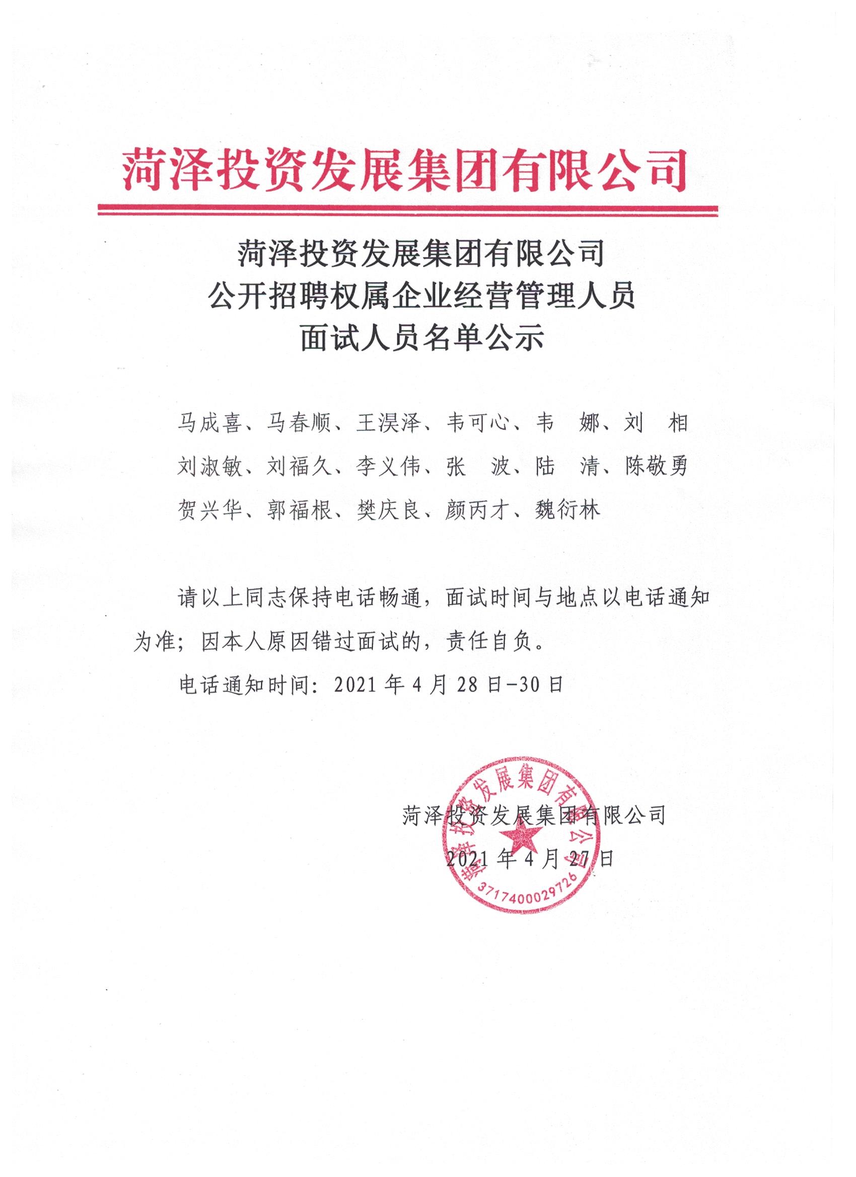 菏澤投資發(fā)展集團有限公司公開招聘權屬企業(yè)經營管理人員面試人員名單公示